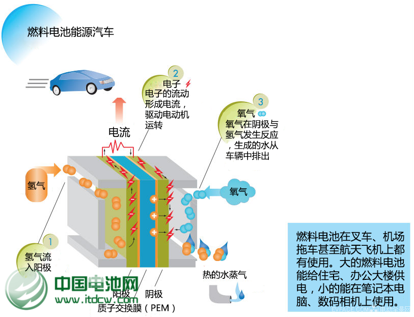燃料電池的工作原理很簡單。燃料電池由陽極、電解質和陰極三個相鄰的區段組成。在兩個相鄰的區段之間,會發生化學反應——氫氣在陽極發生氧化反應,氧氣在陰極發生還原反應,從而消耗燃料,產生電流,帶動負載在系統上的電氣設備,包括電動機、車載設備和組件等。