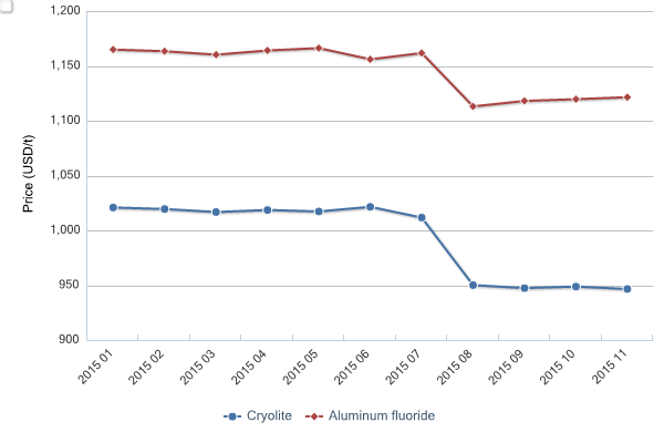 中國冰晶石和氟化鋁的出廠價,2015年1-11月