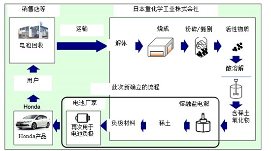 3月初開(kāi)始,日本重化學(xué)工業(yè)株式會(huì)社已向日本電池廠家提供這種稀土作為鎳氫電池的負(fù)極材料,用以制造混合動(dòng)力汽車(chē)搭載的鎳氫電池。此批材料使用的稀土,來(lái)源于386臺(tái)尚未銷(xiāo)售的Honda全新混合動(dòng)力汽車(chē)所搭載的鎳氫電池,這些庫(kù)存汽車(chē)因遭受東日本大地震而無(wú)法使用。今后,只要銷(xiāo)售店零部件更換回收的廢舊鎳氫電池積累到一定數(shù)量,Honda將以相同的模式投入循環(huán)利用。