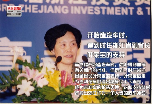 李書福開始造汽車時,尚未得到國家有關部門的批準,但得到了時任浙江省副省長葉榮寶的支持,葉榮寶后來為吉利汽車取得合法身份上下奔走,成為吉利車的護法天使。這種支持背后,折射出浙江作為一個大省的造車沖動。