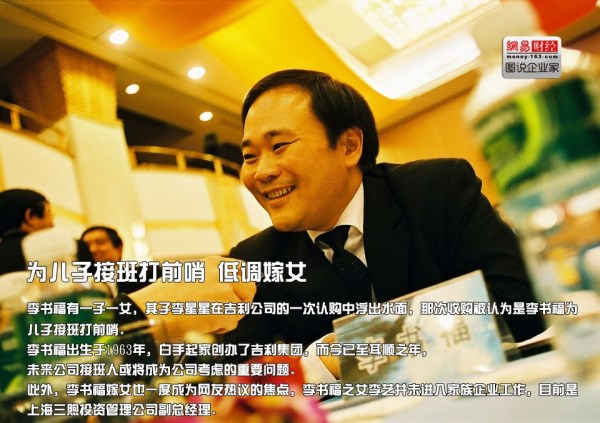 李書福有一子一女,其子李星星在吉利公司的一次認購中浮出水面,那次收購被認為是李書福為兒子接班打前哨。李書福出生于1963年,白手起家創(chuàng)辦了吉利集團,而今已至耳順之年,未來公司接班人或將成為公司考慮的重要問題。此外,李書福嫁女也一度成為網(wǎng)友熱議的焦點,李書福之女李藝并未進入家族企業(yè)工作,目前是上海三煦投資管理公司副總經(jīng)理。