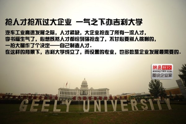 十年前,正高速發(fā)展的吉利集團急需人才,但那時候也碰上中國汽車工業(yè)起飛的時期,與汽車相關的人才成了緊俏商品,吉利集團競爭不過那些實力雄厚的合資企 業(yè),總招聘不到適合的人才。于是,李書福生氣了,心想既然人才都給列強搶走了,不甘心要別人挑剩的,一拍大腿作了個決定——自己制造人才!在這樣的背景 下,吉利大學成立了。
