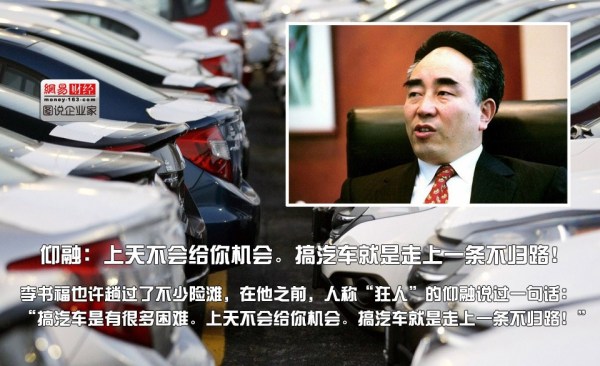 李書福也許趟過了不少險灘,在他之前,人稱“狂人”的仰融說過一句話:“搞汽車是有很多困難。上天不會給你機會。搞汽車就是走上一條不歸路!”。