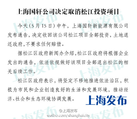 【本網(wǎng)訊 】 據(jù)“上海發(fā)布”新浪官方微博消息,上海國軒新能源有限公司發(fā)布通告,決定收回該公司松江項目全部投資,土地退還政府,不要求任何賠償。上海市松江區(qū)政府表示,將根據(jù)企業(yè)