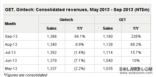 近日,臺(tái)灣太陽能硅片制造商綠色能源科技(GET)公布2013年9月財(cái)報(bào)。據(jù)財(cái)報(bào)顯示,9月,GET合并營(yíng)收為11.6億新臺(tái)幣(3930萬美元),環(huán)比與同比分別增長(zhǎng)2.81%與225.99%,自2011年10月以來的最高水平。 據(jù)經(jīng)濟(jì)日?qǐng)?bào)(Economic Daily News)報(bào)道,GET九月銷售額增長(zhǎng)主要受到出貨量及9月產(chǎn)品價(jià)格小幅攀升的驅(qū)動(dòng)。GET硅錠