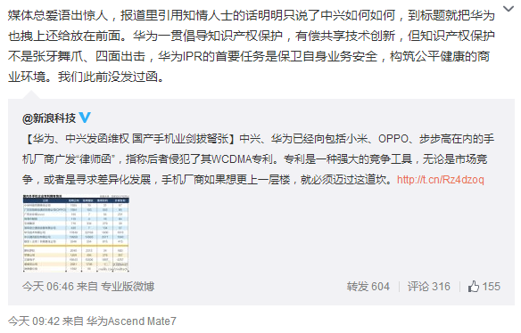 今天上午,華為知識產(chǎn)權(quán)部部長丁建新在微博上表示,“媒體總愛語出驚人,報道里引用知情人士的話明明只說了中興如何如何,到標題就把華為也拽上還給放在前面。”他說,“華為一罐倡導只是產(chǎn)權(quán)保護,有償共享技術(shù)創(chuàng)新,但只是產(chǎn)權(quán)保護不是張揚舞爪、四面出擊,華為IPR的首要任務是保衛(wèi)自身業(yè)務安全,構(gòu)筑公平健康的商業(yè)環(huán)境。我們此前沒發(fā)過函。”