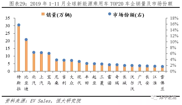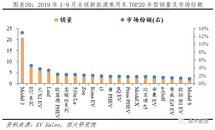 TOP20車型中國占有9席、歐盟占據5席、特斯拉全系上榜、Model 3一枝獨秀。據EV Sales統計,2019年1-9月全球新能源乘用車TOP20車型銷量從高到低依次為:Model 3、EU系列、元/S2 EV、Leaf、歐藍德 PHEV、寶駿 E系列、530e/Le、Zoe、Kona EV、寶馬i3、唐 PHEV、eQ EV、PriusPHEV、Model X、比亞迪e5、帝豪 EV、e-Golf、榮威 Ei5 EV、歐拉 R1 EV、Model S;對應銷量20.80、7.43、6.08、5.38、3.86、3.73、3.68、3.52、3.30、3.06、3.00、2.96、2.87、2.86、2.84、2.73、2.54、2.35、2.26、2.05萬輛;其中中國9款,美國3款,日本2款,歐盟5款,韓國1款。