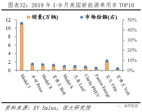 4.2 分車型:特斯拉Model 3一枝獨秀 TOP20車型中國占有9席、歐盟占據5席、特斯拉全系上榜、Model 3一枝獨秀。據EV Sales統計,2019年1-9月全球新能源乘用車TOP