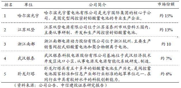通信用蓄電池市場是高端蓄電池市場,產品技術含量較高、產業較為集中,客戶相對穩定。公司蓄電池業務主要由子公司臥龍燈塔實施,臥龍燈塔是該領域的龍頭企業之一,占市場份額的6%左右,具有較強的市場競爭力。