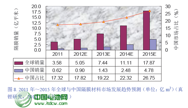 2011年全球鋰離子電池隔膜市場銷量3.58 億m2,中國電池網(wǎng)-中國電池雜志戰(zhàn)略合作機構(gòu)——真鋰研究預(yù)計,這個市場今后幾年會以年均復(fù)合增長率48.47%的速度成長,到2015 年市場規(guī)模將達(dá)到17.87 億m2,是2011 年的約5 倍。中國市場的成長速度要高于全球,預(yù)計到2015 年中國市場將達(dá)到4.78 億m2 的規(guī)模,年均復(fù)合增長率為66.63%。