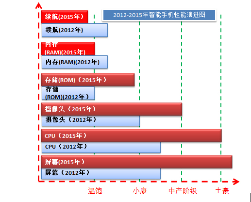 手機已經從通信終端演變成為移動互聯網終端,用戶對手機的功能的需求、對手機體驗的需求也在不斷變化。手機從以打電話、發短信、看內容為主,演變成為交互應用為主;用戶對手機體驗的需求,從信號好、待機長,演變成為網速快、運行快、拍照好等。但遺憾的是,手機技術的發展卻很不均衡,有的發展太超前,有的卻一直拖后腿,使得手機產品一直存在明顯的體驗瓶頸,一些瓶頸甚至快成為壓垮手機行業乃至移動互聯網行業發展的致命因素了。下圖是我制作的近三年(2012-2015)手機主要配置和性能演進圖: