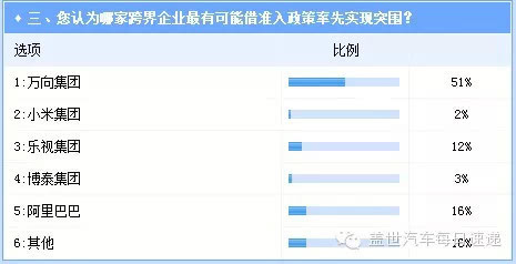 另外,已經(jīng)分別與上汽和北汽兩大整車廠合作的國內(nèi)互聯(lián)網(wǎng)巨擘阿里巴巴和樂視是另外兩個支持率在兩位數(shù)的企業(yè),分別占比16%和12%。