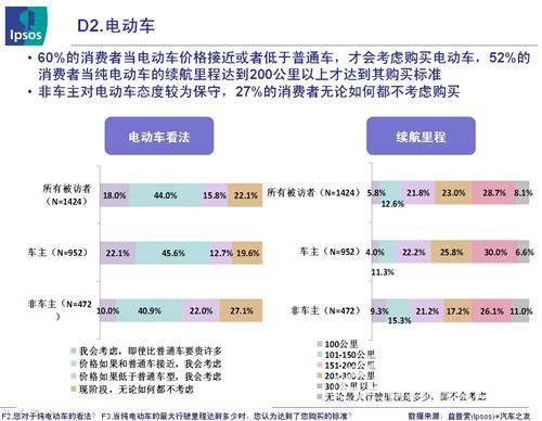 對(duì)于電動(dòng)車,60%的益普索(Ipsos)被訪者表示,當(dāng)電動(dòng)車價(jià)格接近或者低于普通車,才會(huì)考慮購(gòu)買(mǎi)電動(dòng)車,52%的消費(fèi)者當(dāng)純電動(dòng)車的續(xù)航里程達(dá)到200公里以上才達(dá)到其購(gòu)買(mǎi)標(biāo)準(zhǔn);非車主對(duì)電動(dòng)車態(tài)度較為保守,27%的消費(fèi)者無(wú)論如何都不考慮購(gòu)買(mǎi)。