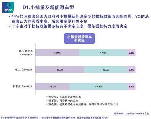 益普索(Ipsos)數(shù)據(jù)顯示,44%的消費(fèi)者會(huì)因?yàn)檎畬?duì)小排量新能源車型的扶持政策而選擇購(gòu)買(mǎi),8%的消費(fèi)者認(rèn)為購(gòu)買(mǎi)成本高,后續(xù)用車便利性不足;非車主對(duì)于扶持政策更多持有不確定態(tài)度,要依據(jù)扶持力度而決定。