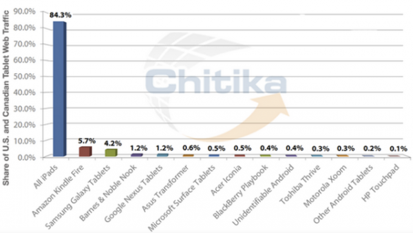 從統計結果中可以看出,在Chitika的統計范圍之內,有84.3%的網絡數據流量來自于iPad。相比之下雖然競爭對手三星的平板電腦型號可謂非常之多,但是所占比重僅有4.2%,僅位列第三。雖然對于平板電腦用戶來說,各種應用的使用頻率要遠高于瀏覽網頁,不過這也不足以解釋iPad為何擁有如此巨大的優勢。