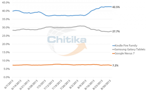 從Chitika對今年6月至8月的數據流量的統計來看,iPad依然保持著平板電腦市場的霸主地位。雖然谷歌在今年7月發布了新一代的Nexus 7平板電腦,但是Android平板在所有網絡數據流量中的比重卻沒有明顯的增長。雖然與iPad的差距很大,但是亞馬遜的Kindle Fire系列平板電腦還是憑借著較高的性價比以5.7%的份額位居次席。