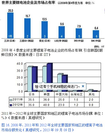2009 年的時(shí)候韓國的主流媒體《朝鮮日?qǐng)?bào)》曾為此還進(jìn)行過專門報(bào)道,整理過一個(gè)圖表(見圖16 上,當(dāng)時(shí)日本IIT 的統(tǒng)計(jì)結(jié)果是日韓中三國的全球占有率高達(dá)96%,其中日本占據(jù)了半壁江山,為52.3%),并報(bào)道了韓國商務(wù)部部長的對(duì)外宣言:“韓國的目標(biāo)是在2010年超越日本成為全球鋰離子電池供應(yīng)第一大國。”