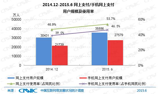 截至2015年6月,我國使用網上支付的用戶規模達到3.59億,較2014年底增加5455萬人,半年度增長率17.9%。與2014年12月相比,我國網民使用網上支付的比例從46.9%提升至53.7%。與此同時,手機支付增長迅速,用戶規模達到2.76億,半年度增長率為26.9%,是整體網上支付市場用戶規模增長速度的1.5倍,網民手機支付的使用比例由39%提升至46.5%。