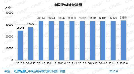 隨著2011年初,全球IPv4地址總庫分配完畢,我國IPv4地址總數基本保持不變。截至2015年6月,我國IPv4地址數量共計為3.36億個。