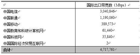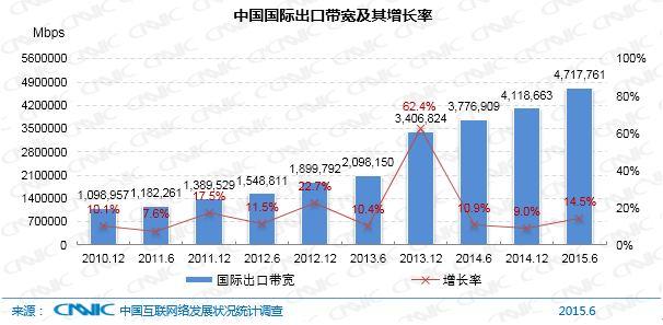 截至2015年6月,中國國際出口帶寬為4,717,761 Mbps,半年增長率為14.5% 。