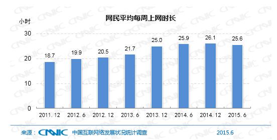 2015年上半年,中國網民的人均周上網時長達25.6小時,相比2014年底減少0.5個小時。