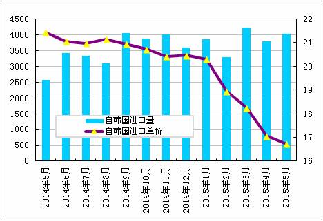 2015年5月份從韓國進口多晶硅量增加至4027噸,環比增幅為6.1%;5月份進口單價小幅下滑至16.74美元/千克,環比降幅為1.9%。