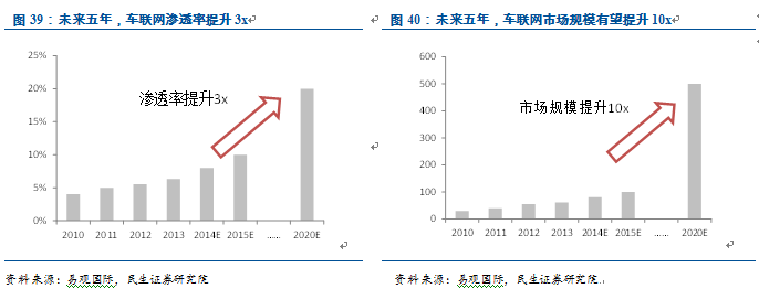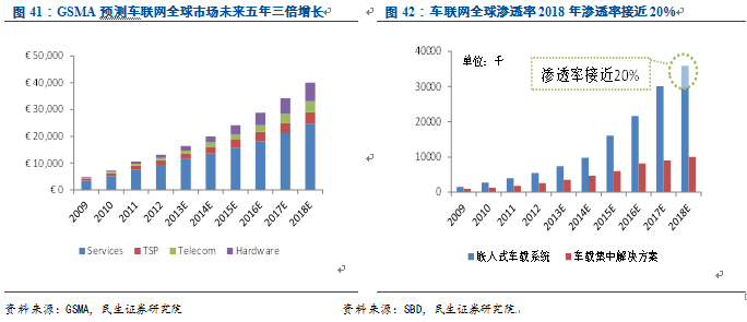 車聯網硬件價格下降,從高端車系向大眾車系普及。隨著移動互聯網設備的成熟和發展,車聯網硬件從過去1,000美元以上已經降到500美元。在互聯網廠商介入后,相關設備的價格將繼續快速下降。此外,根據產業鏈調研,大多數國際整車廠已經開始將車聯網預裝在大眾車系上,包括榮威、吉利等本土汽車品牌也已經逐漸在部分車型上預裝車聯網系統。