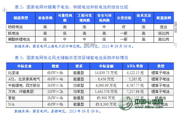 在各種儲能技術(shù)中,國家電網(wǎng)內(nèi)部詳細(xì)比較了各自的優(yōu)缺點(diǎn)(主要是考慮技術(shù)風(fēng)險控制、裝置多樣性,同時兼顧工程的示范意義),最后選中了鋰離子電池、釩電池和鈉硫電池,其中鋰離子電池選擇的是磷酸鐵鋰路線。從上海電力設(shè)計(jì)研究院的一份資料(見表2)來看,國際電網(wǎng)認(rèn)為就實(shí)際工程而言,磷酸鐵鋰儲能系統(tǒng)綜合性能最好,其次是鈉硫電池,而釩電池最差。據(jù)此,國家電網(wǎng)確定三種儲能技術(shù)的配置原則。表3是該項(xiàng)目儲能電池最終的采購清單及中標(biāo)情況,也印證了這一點(diǎn)。該項(xiàng)目于2011年03月23日和04月15日發(fā)布了兩次儲能設(shè)備采購招標(biāo)公告,其中03月23日的是鋰離子電池,04月15日把液流電池(釩電池)補(bǔ)充進(jìn)去,只是,截至現(xiàn)在也沒有發(fā)布鈉硫電池的招標(biāo)公告。