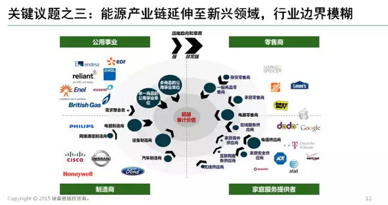 傳統的能源行業和新興產業互相滲透,共同角逐能源服務市場。例如,超市會進入能源零售領域;電信供應商、家電家居制造商和零售商,也會利用智能家居的產品和服務進入能源服務領域;此外,高科技企業也在圍繞能源互聯網提供解決方案,甚至使電動汽車也成為移動儲能裝置。