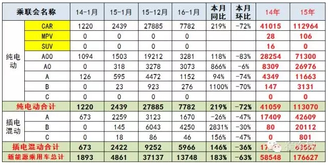 根據乘聯會的廠家銷售數據,1月新能源乘用車呈現同比高增長和環比深度調整的特征。2016年1月新能源狹義乘用車銷量13748臺,同比增長183%,環比12月下降63%,總體較好。其中插電混合動力達到5966臺,同比增長146%,環比下降36%;純電動車達到7782臺,同比增長219%。環比下降72%。