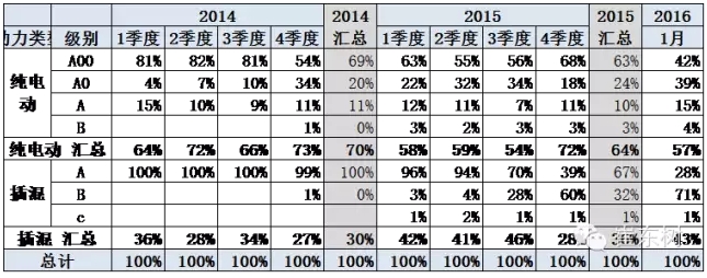 15年的純電動車中的A00級車占比達63%,且A0級成為純電動乘用車的絕對主力,這兩類組合的經濟型電動車成為主力。但16年1月的A級電動車爆發增長到15%,這是暫時的年度波動數量的特殊狀態,同時也是A00級電動車的暫時調整的影響。
