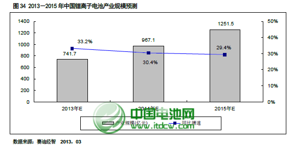 就中國市場而言,得益于動(dòng)力鋰離子電池的快速發(fā)展,2013 年鋰離子電池整體市場規(guī)模將達(dá)到741.7 億元,同比增長33.2%,并且未來三年市場規(guī)模增速均會(huì)保持在30%以上,到2015 年整個(gè)中國鋰離子電池的市場規(guī)模將突破1000 億元,達(dá)到1251.5 億元。