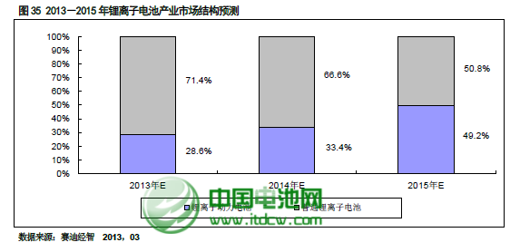 從鋰離子電池市場結(jié)構(gòu)來看,我們認(rèn)為鋰離子市場規(guī)模未來三年內(nèi)增長的動(dòng)力來自于以新能源汽車電池為代表的動(dòng)力電池。到2015 年鋰離子動(dòng)力電池市場規(guī)模占比將達(dá)到49.2%。