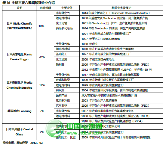中國所需的六氟磷酸鋰電解質基本都從日本采購,關鍵原材料的受制于人嚴重阻礙了中國整個電解液產業的發展。近期,國內企業已經充分認識到這點,紛紛加大對六氟磷酸鋰的研發和投資力度。目前能夠產業化生產六氟磷酸鋰的企業主要包括多氟多、天津金牛、廣州天賜、九九久等企業。據中國電池網-中國電池雜志了解,目前多氟多的六氟磷酸鋰已經出口到韓國等國家。