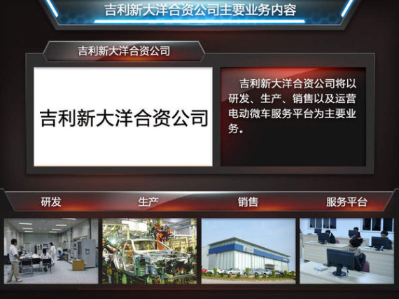 吉利新大洋公司將以研發、生產、銷售以及運營電動微車服務平臺為主要業務。公司的管理總部、銷售總公司、純電動汽車研發中心、城市微行電動汽車租賃公司以及年產30萬臺的生產基地全部將設在寧海,在以城市微型純電動車為主要產品的基礎上,繼續研發更高技術含量的產品。