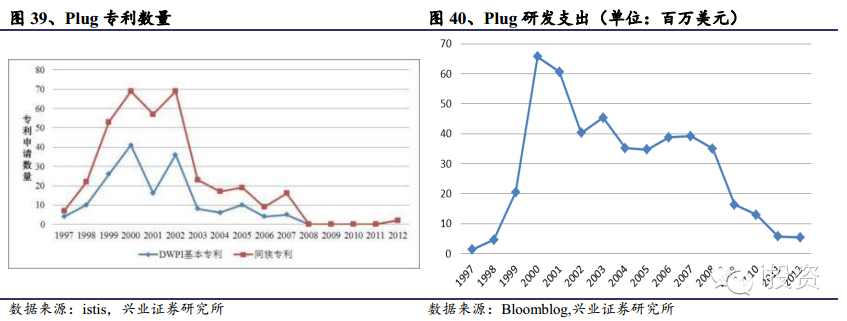 Plug公司有一定數量的基本專利,從1997年開始到2000年申請專利迅速增長,而其后維持在較高量上波動,而從2003年開始專利數量急劇萎縮,特別是從2008年開