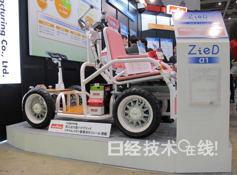 村田制作所在“第6屆日本國際汽車電子技術展”(2014年1月15日~17日,東京有明國際會展中心)上,展示了配備該公司正在開發的高輸出功率鋰離子電池的超小型交通工具。