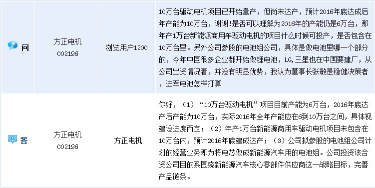 方正電機(002196)周二在全景網互動平臺上透露,“10萬臺驅動電機”項目目前產能為6萬臺,2016年底達產后產能為10萬臺,實際2016年全年產能應在6到10萬臺之間,具體視建設進度而定。