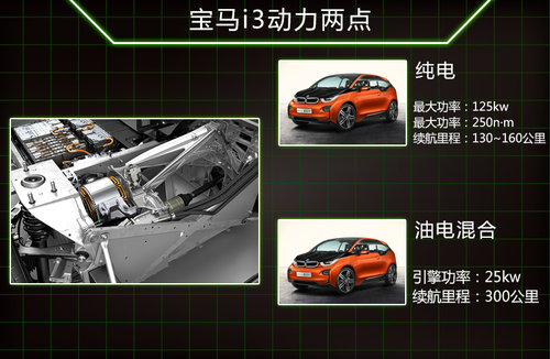 在動力上寶馬i3將分為純電動版以及油電混合版,在純電動版本中寶馬i3配備了一臺功率最大功率125kw,最大扭矩250nm的電動機,讓寶馬i3百公里加速僅為7.2秒,續航里程在130公里~160公里之間,而帶有雙缸引擎的寶馬i3則最大續航里程則會超過300公里。