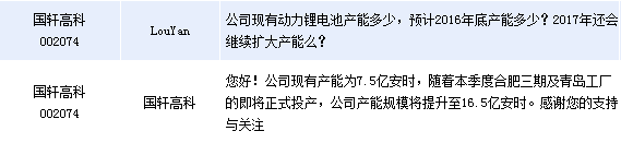 國軒高科(002074)周四在全景網(wǎng)互動平臺上表示,公司動力鋰電池現(xiàn)有產(chǎn)能為7.5億安時,隨著本季度合肥三期及青島工廠的即將正式投產(chǎn),公司產(chǎn)能規(guī)模將提升至16.5億安時。