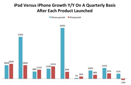 當iPad還是新鮮事物時,有人繪制了表格展示其瘋狂的增長速度。很多人相信,iPad的銷售額會愈加突飛猛進。