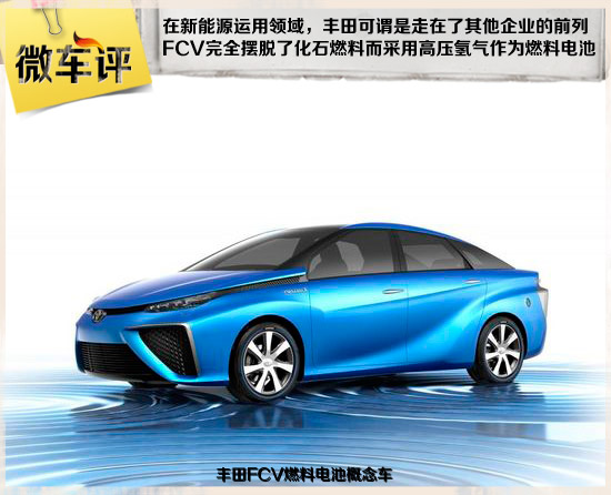 此次豐田亮相的FCV概念車脫胎于2011年亮相的FCV-R概念車,不過在經過兩年的發展之后,FCV概念車擁有了更加接近量產化的外觀,同時還增加了大量的空氣動力學套件以降低能耗的損失。FCV最引人注意的部分在于動力部分,燃料電池的動力讓它完全擺脫了化石燃料轉而采用了高壓氫氣作為燃料電池的反應載體。