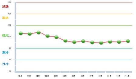 11月份中輕景氣指數(shù)為96.36 ,位于“穩(wěn)定”區(qū)域。與10月份相比中輕景氣指數(shù)上升0.74。