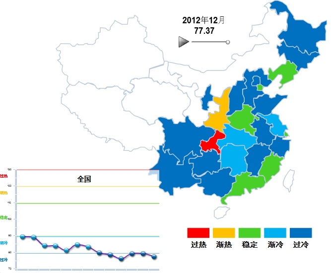 2012年12月,從分地區電池行業景氣指數看,重慶處于“過熱”區,陜西漸熱,遼寧、天津、河南、上海、福建、廣東穩定,其他地區漸冷或過冷。