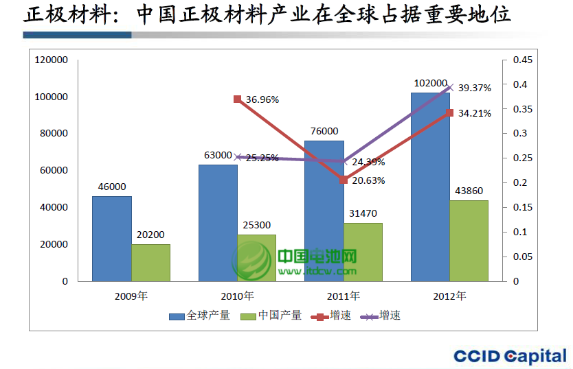 統計顯示,2012年全球正極材料產量約為120000噸,中國正極材料企業的產能增速達34.21%。