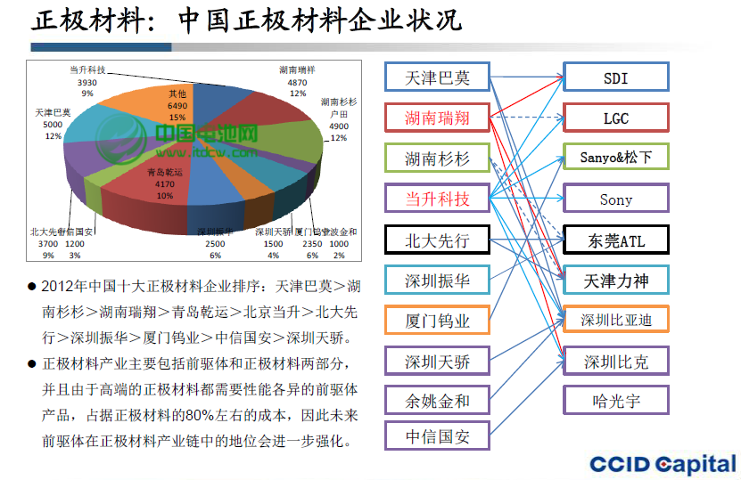 【本網訊】據賽迪顧問最新的統計數據顯示,2012年鋰離子電池正極材料國產品牌(不含國外品牌)產量為43860噸,正極材料產生新的“四大天王”:天津巴莫、湖南戶田杉杉、湖南瑞翔、乾運高科,新的二線品牌“戰國六雄”:北京當升、北大先行、深圳振華、廈門鎢業、中信國安、深圳天驕。