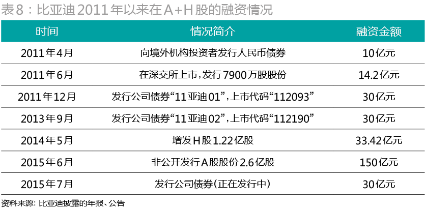 2011以來,比亞迪通過股票IPO和發行公司債券,在A股及H股資本市場上募集資金近300億元(表8)。上述融資項目的順利完成,得益于王傳福巧妙利用時機。