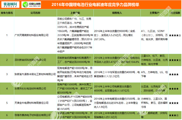 • 2016年中國鋰電池行業電解液年度競爭力品牌榜單 日期:2016-11-16 15:44:49 點擊:2524 好評:0