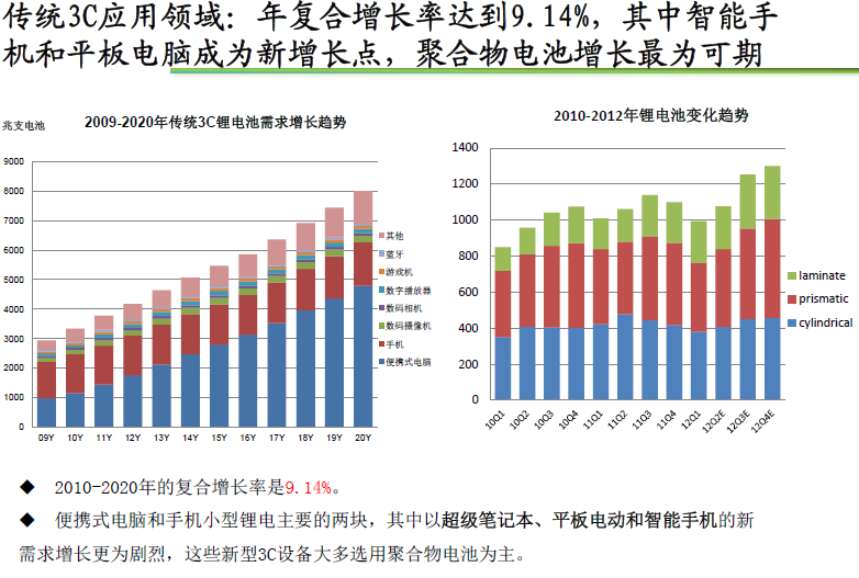 2010-2020年的復(fù)合增長(zhǎng)率是9.14%。 便攜式電腦和手機(jī)小型鋰電主要的兩塊,其中以超級(jí)筆記本、平板電動(dòng)和智能手機(jī)的新需求增長(zhǎng)更為劇烈,這些新型3C設(shè)備大多選用聚合物電池為主。...