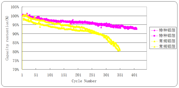 采用特種鋁箔后,電池的倍率性能顯著提升,特別是在大倍率(大于3C)的情況下,倍率放電容量提升在15%以上,或者在同等倍率情況下,特種鋁箔可以提高電池的能量密度。...